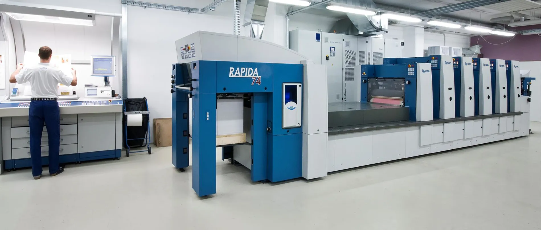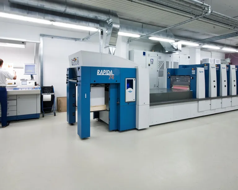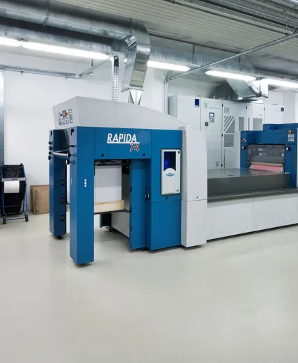 Il nostro nuovo parco macchine è costato parecchio, ma dispone anche di potenzialità enormi. Ora sulla nostra macchina a colori K&B Rapida 74-5-L 5 con colonna di laccatura e asciugatura a raggi infrarossi possiamo, ad esempio, stampare tre tipi di retino, normale, sublima e Crystalraster a modulazione di frequenza, che brillano del tutto senza punto. La misurazione del colore Densitronic garantisce altissima precisione cromatica in ogni edizione, e apre le porte alla creatività: colori metallizzati o luminescenti, lacche profumate e ad effetto, tutto è possibile. Per quanto riguarda la tutela dell'ambiente, siamo all'avanguardia: la produzione delle forme di stampa avviene completamente senza prodotti chimici.
